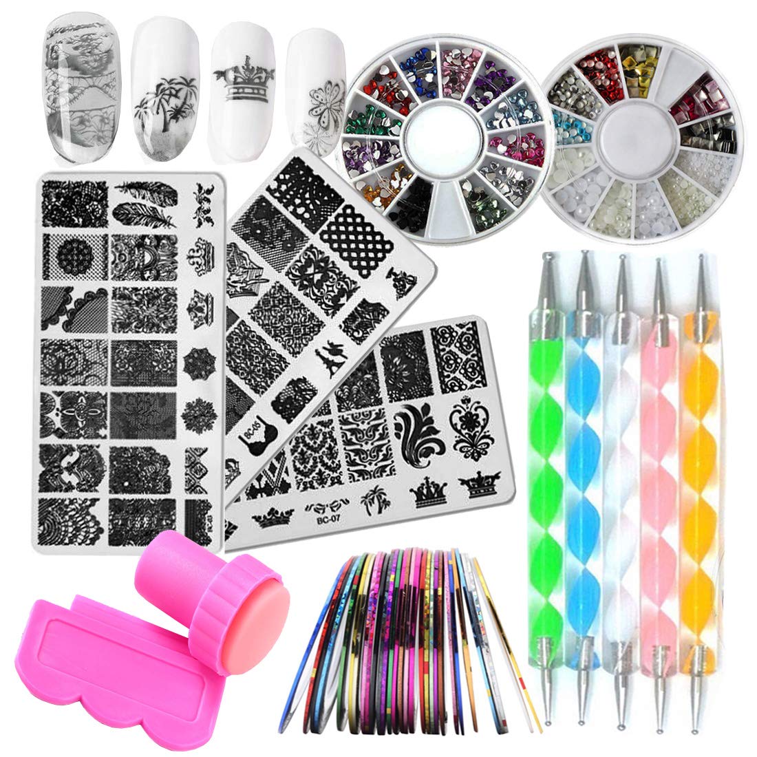 Amazon Com Nail Art Kit 3pc Flower Animal Nail Stamping Plate 2 Acrylic Nail Rhinestone Decoration 5pc Mandala Dotting Pen 10pc Holographic Nail Striping Tape Line With Pink Nail Stamper Scraper Beauty
