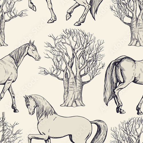 Vintage Beautiful Background With Horses And Trees Creative Forest Retro Seamless Pattern Art Fabric Fantasy Vector Print Wallpaper For Decoration And Design Wall Mural Pixers We Live To Change