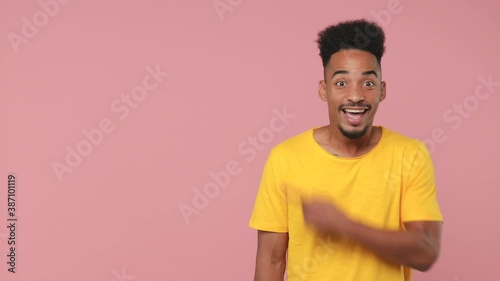 Surprised Young African American Man 20s Years Old In Yellow T Shirt Posing Isolated On Pink Background Studio People Lifestyle Concept Looking Camera Pointing Index Finger Aside Showing Thumb Up Wall Mural Vidi